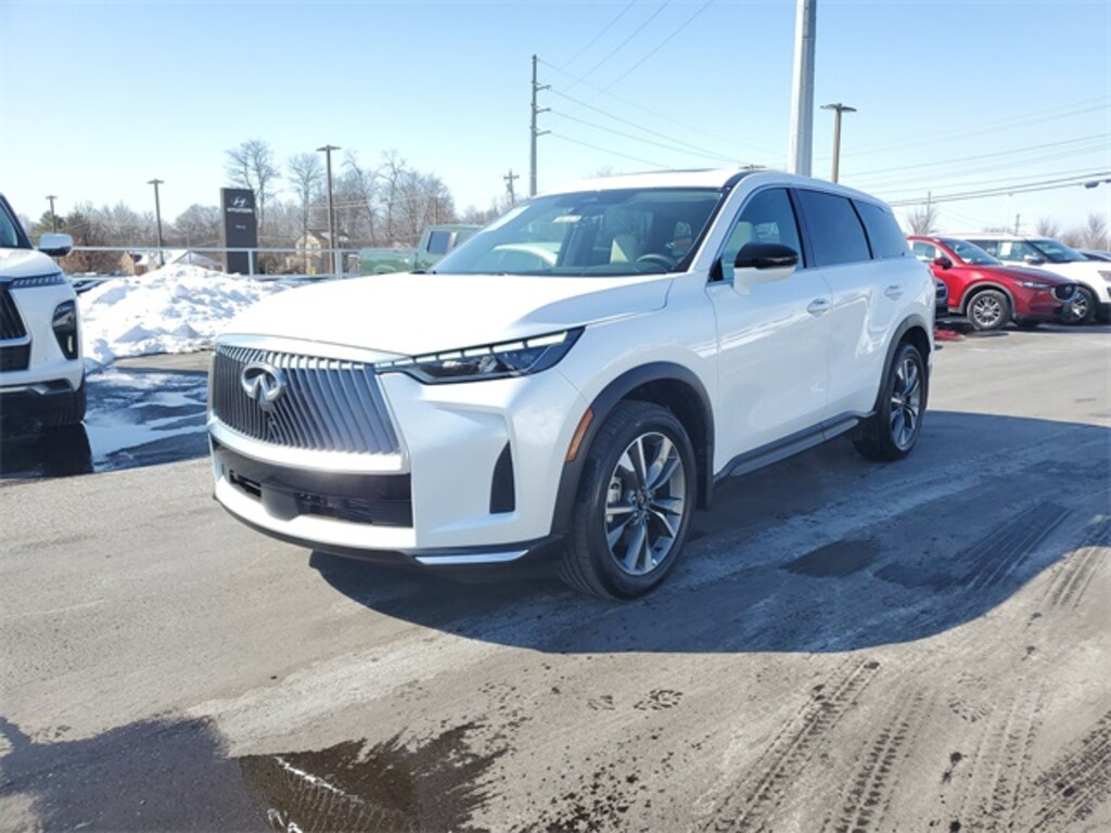 Certified. Radiant White 2026 INFINITI QX60 PURE FWD 9-Speed Automatic 2.0L I4 PDI Turbocharged DOHC 16V 268hp *CERTIFED*, *1 OWNER*, *LIFETIME POWERTRAIN WARRANTY*, 3rd row seats: bench, Apple CarPlay/Android Auto, Auto High-beam Headlights, Blind Spot Warning, Brake assist, Dual front impact airbags, Dual front side impact airbags, Electronic Stability Control, Four wheel independent suspension, Knee airbag, Navigation system: Google Built-in, Overhead airbag, Power Liftgate, Power moonroof: Panoramic, Rear Parking Sensors, Rear side impact airbag, Reclining 3rd row seat, Remote keyless entry, Steering wheel mounted audio controls, Super Premium Paint, Tailorfit-Appointed Seating Surfaces, Traction control.