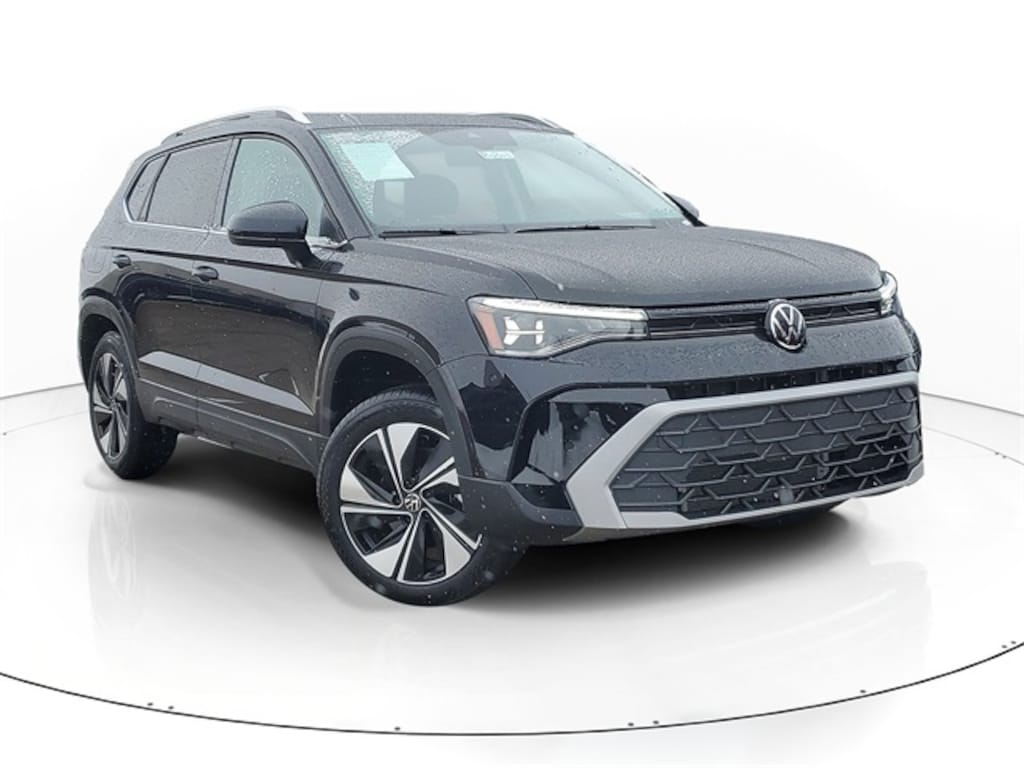 Certified. Deep Black Pearl 2025 Volkswagen Taos 1.5T SE AWD 8-Speed Automatic with Tiptronic 1.5L I4 Turbocharged DOHC 16V LEV3-SULEV30 174hp Apple CarPlay, Bluetooth, Android Auto, Keyless Entry, Rear View Camera, *CERTIFED*, *1 OWNER*, *LIFETIME POWERTRAIN WARRANTY*, Active Blind Spot Monitor, Auto High-beam Headlights, Brake assist, CloudTex & Cloth Seating Surfaces, Dual front impact airbags, Dual front side impact airbags, Electronic Stability Control, Four wheel independent suspension, Heated Front Bucket Seats, Overhead airbag, Steering wheel mounted audio controls, Traction control.