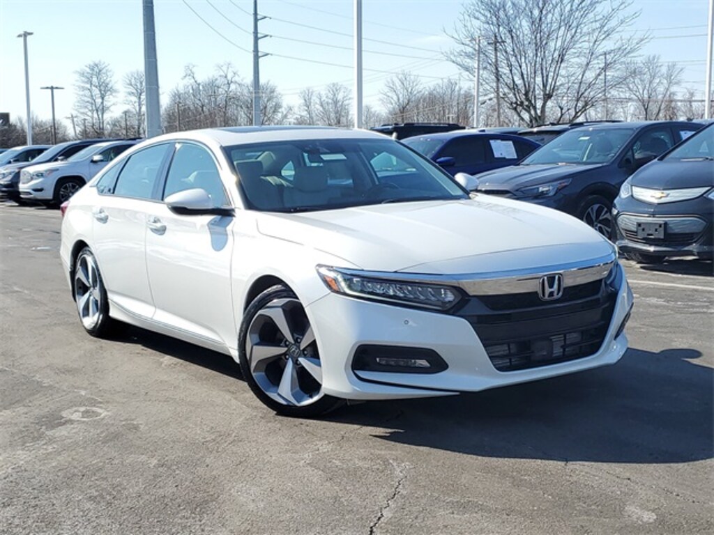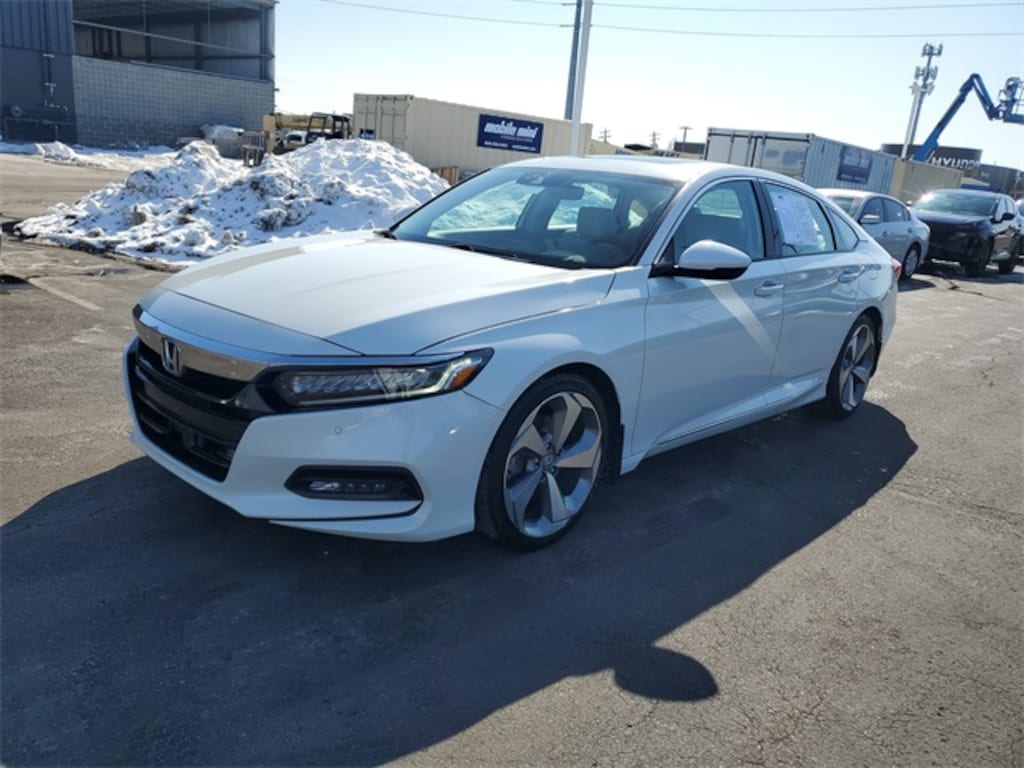 White 2018 Honda Accord Touring FWD CVT 1.5T I4 DOHC 16V Turbocharged VTEC Black Leather, Apple CarPlay/Android Auto, Auto High-beam Headlights, Blind Spot Information (BSI) System warning, Brake assist, Dual front impact airbags, Dual front side impact airbags, Electronic Stability Control, Exterior Parking Camera Rear, Front anti-roll bar, Fully automatic headlights, Heads-Up Display, Heated & Ventilated Front Bucket Seats, Knee airbag, Leather-Trimmed Seats, Navigation System, Overhead airbag, Power Moonroof, Rear anti-roll bar, Remote keyless entry, Steering wheel mounted audio controls.